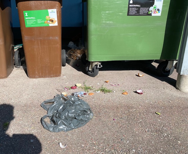 Nu är det någon som har slängt sopor bredvid våra sopkärl igen. Men det kan väl inte vara en vuxen som lämnar det så här så att någon annan måste plocka bort skräpet. Ni som har barn och barnbarn som hjälper till med att kasta sopor tala om för dom att det är viktigt att kasta i kärlen. För det finns ju fåglar som gillar våra sopor som dom kommer åt om man inte kastar dom i kärlen. Det fanns mera äckligt skräp bakom den gröna tunnan. Och jag kan nämna att det personen som är skyldig till detta har inte sorterat sopor heller. Bland annat var det mjukplast som låg bakom den gröna tunnan. Jag ber om skärpning!
